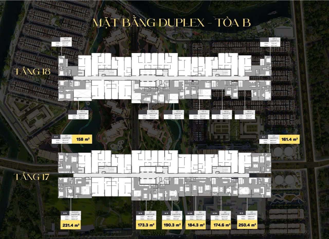 - Căn hộ Duplex: Từ khoảng 143.94 m² đến 372.2 m². Một số nguồn tin khác cho biết diện tích từ 150m² đến 200m².