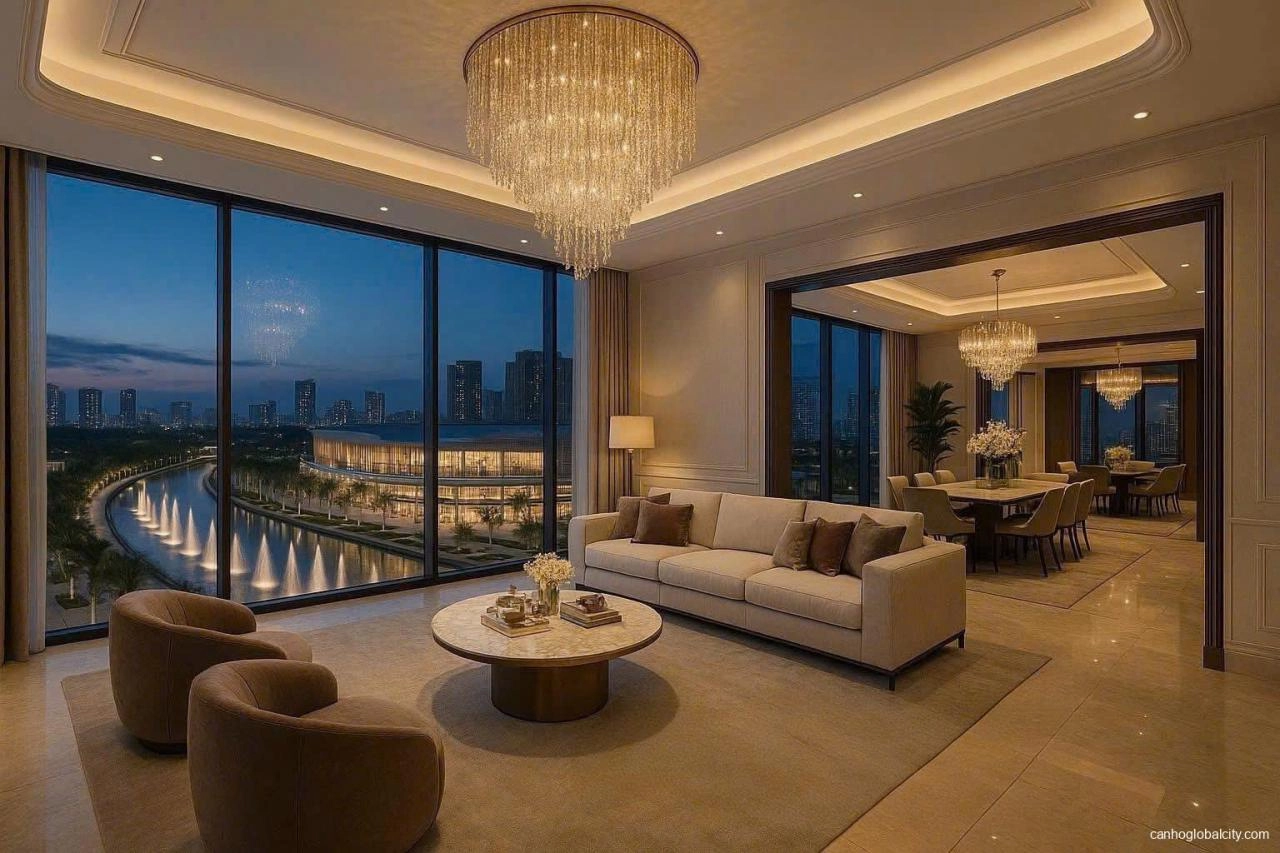 [Đề xuất hình ảnh: Phối cảnh nội thất sang trọng của một căn hộ Duplex với trần cao thông tầng và tầm nhìn ra thành phố. Alt text: Nội thất căn hộ Duplex The Global City.]